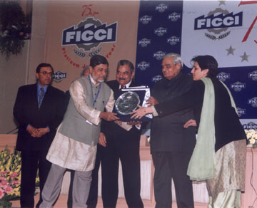 Dr. Anil K. Rajvanshi receives the award from the Prime Minister Shri Vajpayee. On the right to Shri Vajpayee is Dr.Lodha the FICCI President.